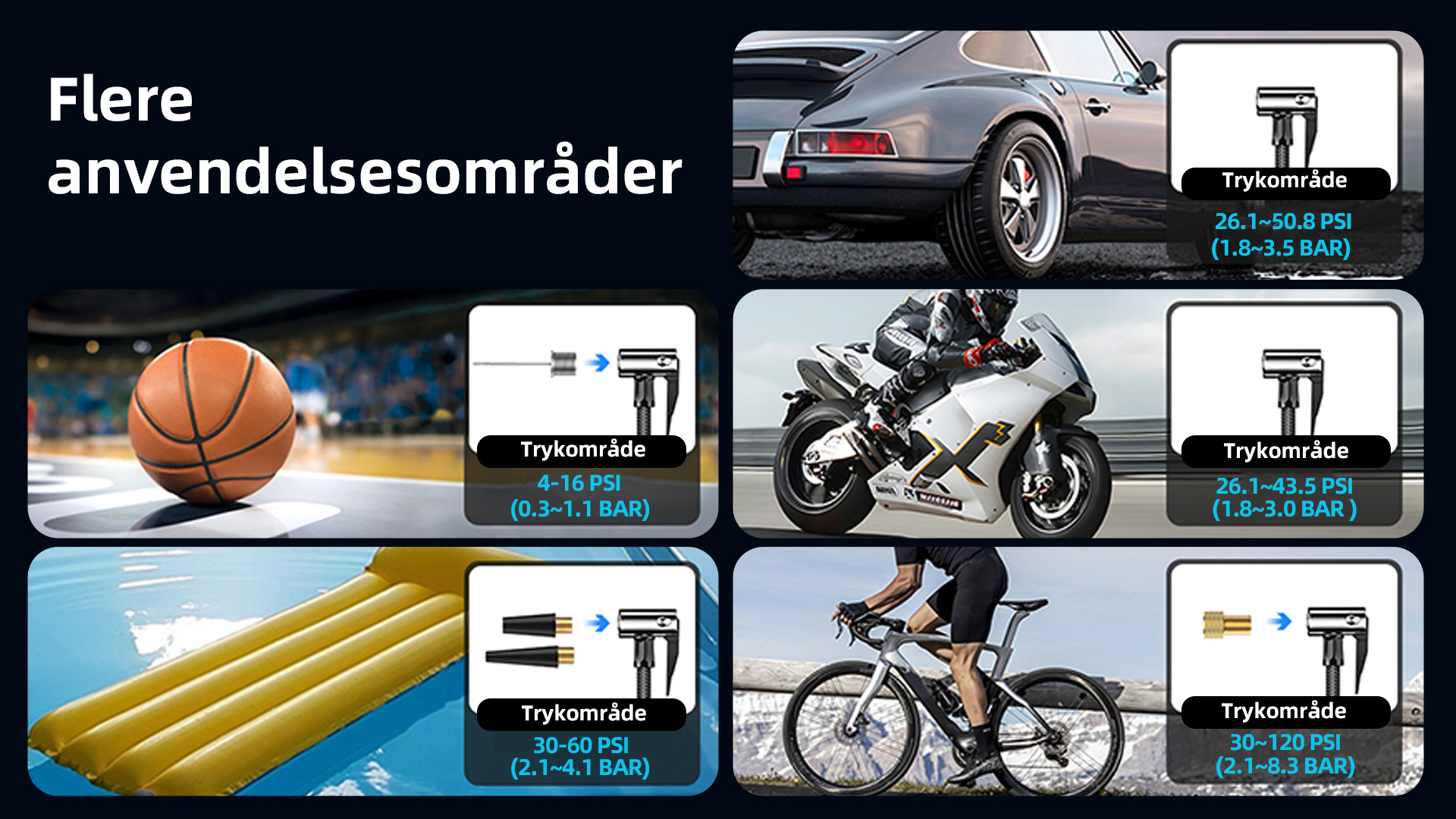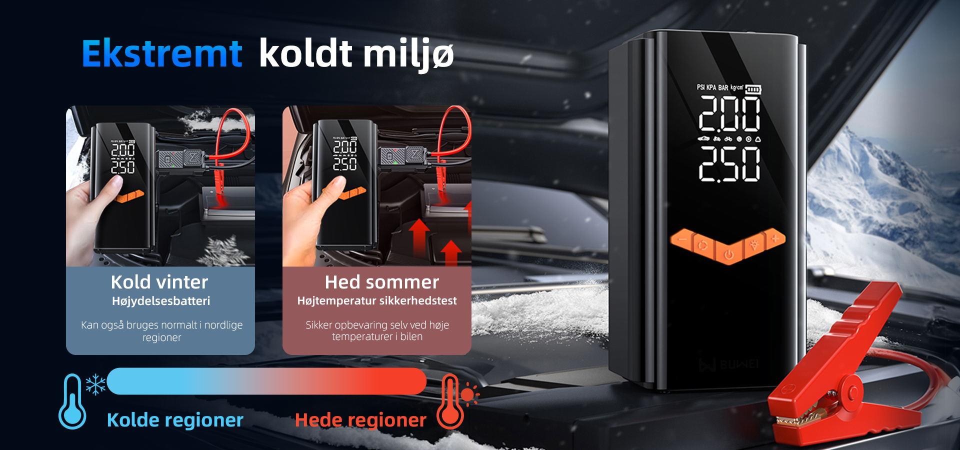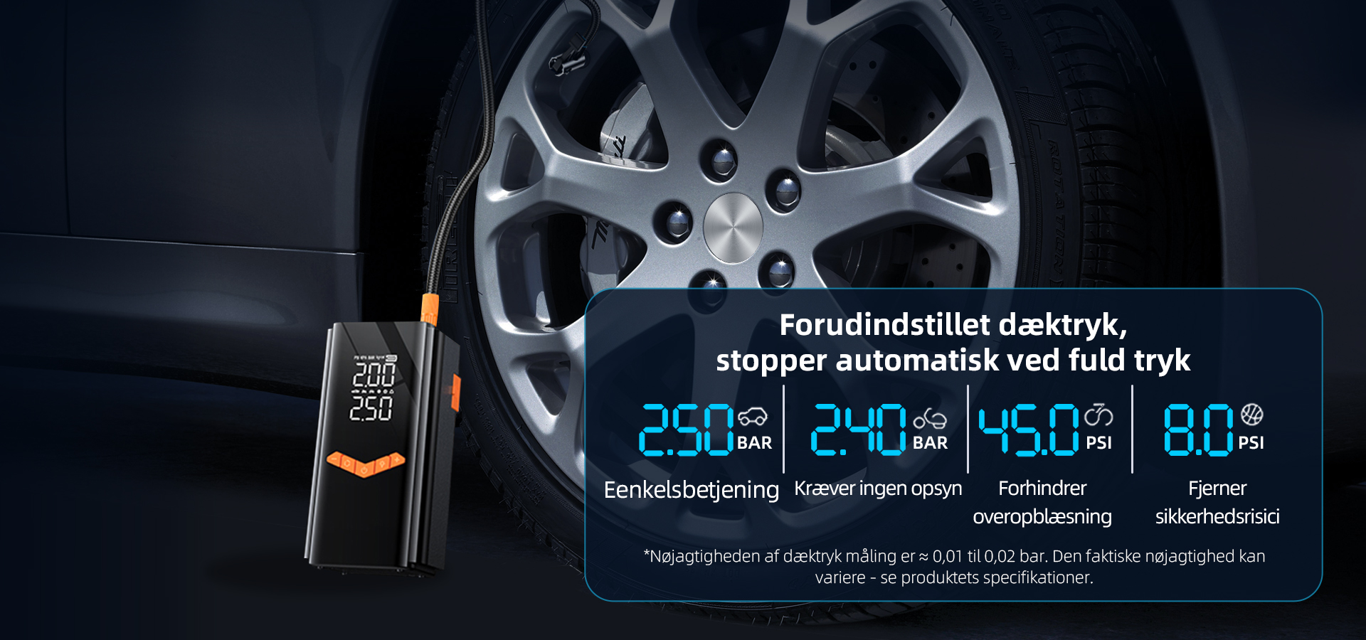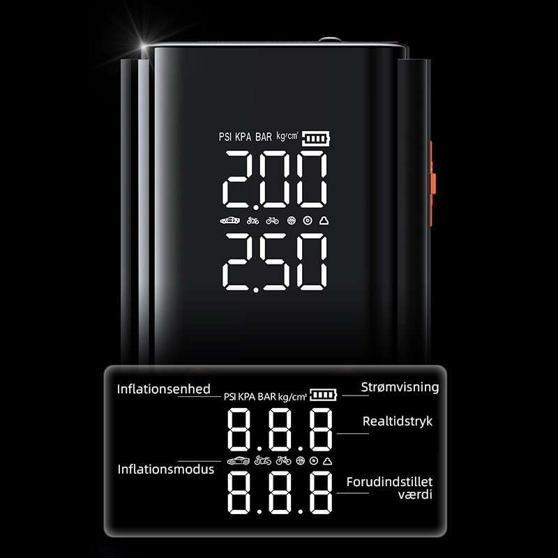 • Krystalklare dobbeltskærme (PSI/KPA auto-skift)