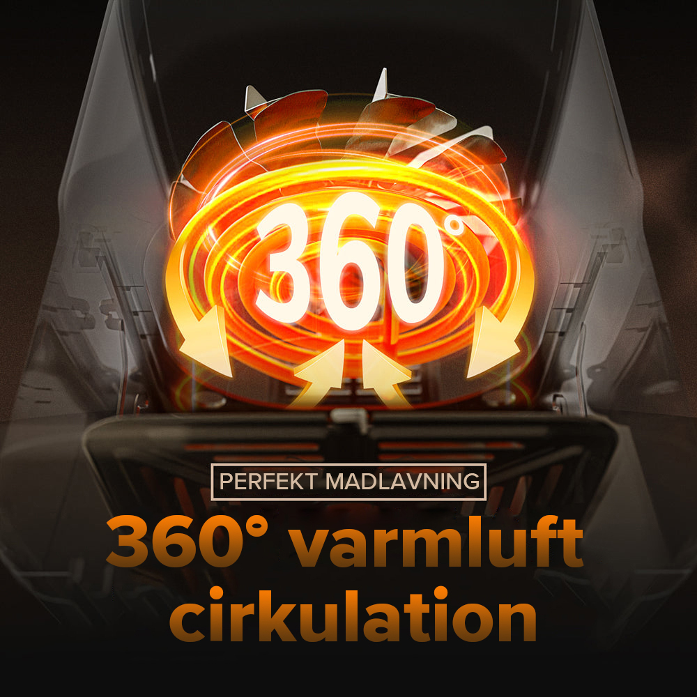 Airfryeren bruger 360° hurtig varmluftcirkulation for at sikre, at dine ingredienser hurtigt opvarmes fra alle retninger, vidunderlig friturestegt smag og sprød konsistens er lavet uden fedt og kalorier.