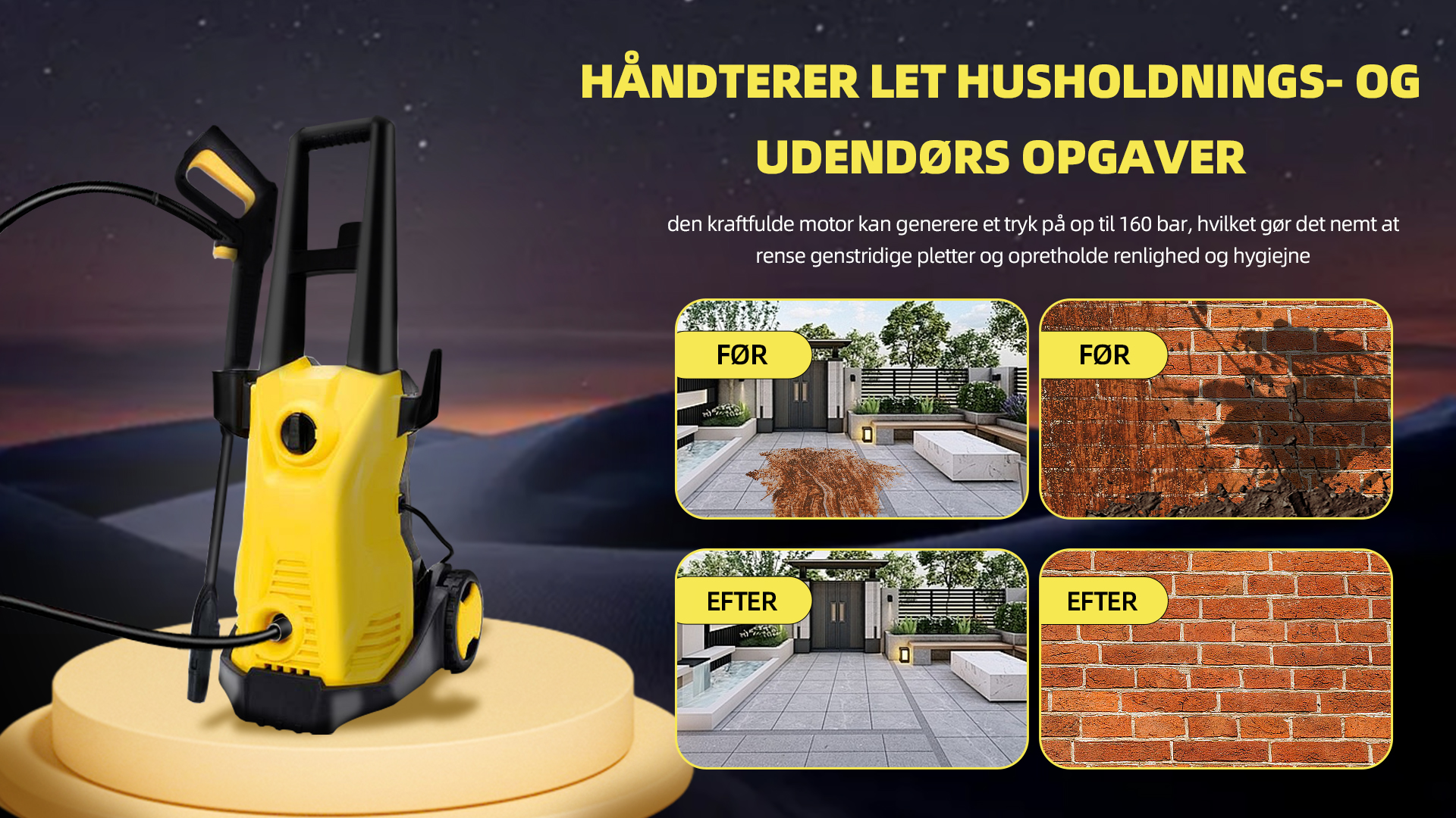 Vores højtryksrenser er designet med en robust vandtæt konstruktion, der sikrer pålidelig præstation selv under de mest krævende forhold. Uanset om den bruges til udendørs projekter eller indendørs rengøringsopgaver, er den bygget til at modstå vandudsættelse uden at gå på kompromis med effektivitet eller sikkerhed. Dette forlænger udstyrets levetid.